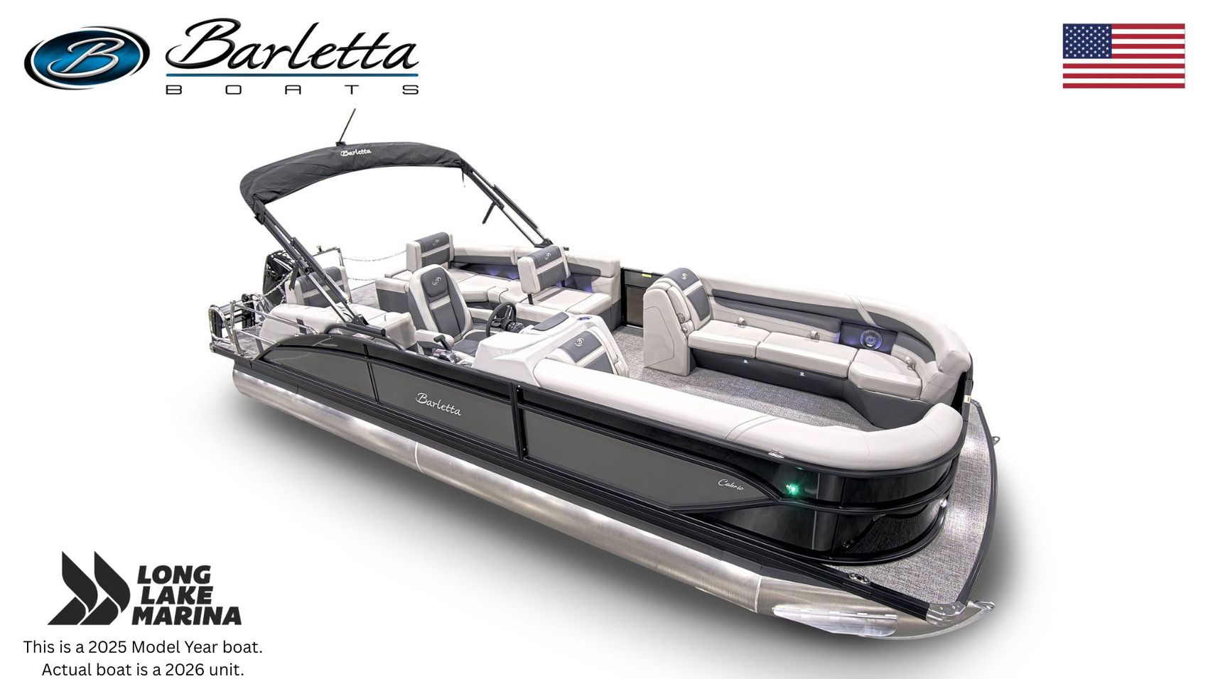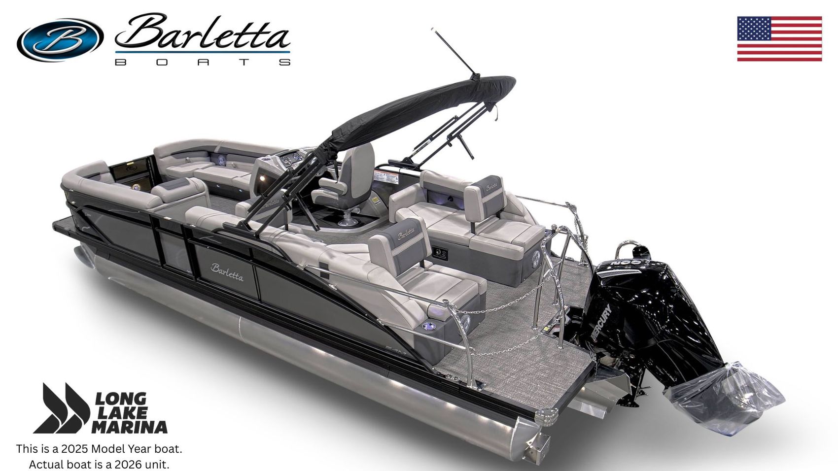 The 2026 Barletta Cabrio C24M is a spacious and upscale pontoon designed for premium comfort, entertaining, and confident performance on the water. At 24 feet, this model offers an expansive layout with plenty of room for hosting friends and family, highlighted by an extended port-side chaise with a convertible club seat that adds flexibility for lounging, socializing, or stretching out during long lake days. Powered by a Mercury 200L FourStroke engine, the C24M delivers smooth acceleration and reliable cruising power, enhanced by power-assist steering for effortless handling. The tritoon package with midship storage provides excellent stability and convenient space for gear and water toys. Premium upholstery, a pedestal table with Yeti-ready cupholders, and interior RGB lighting create a welcoming onboard atmosphere from day to night, making the Cabrio C24M ideal for relaxed cruising and memorable time on the water.