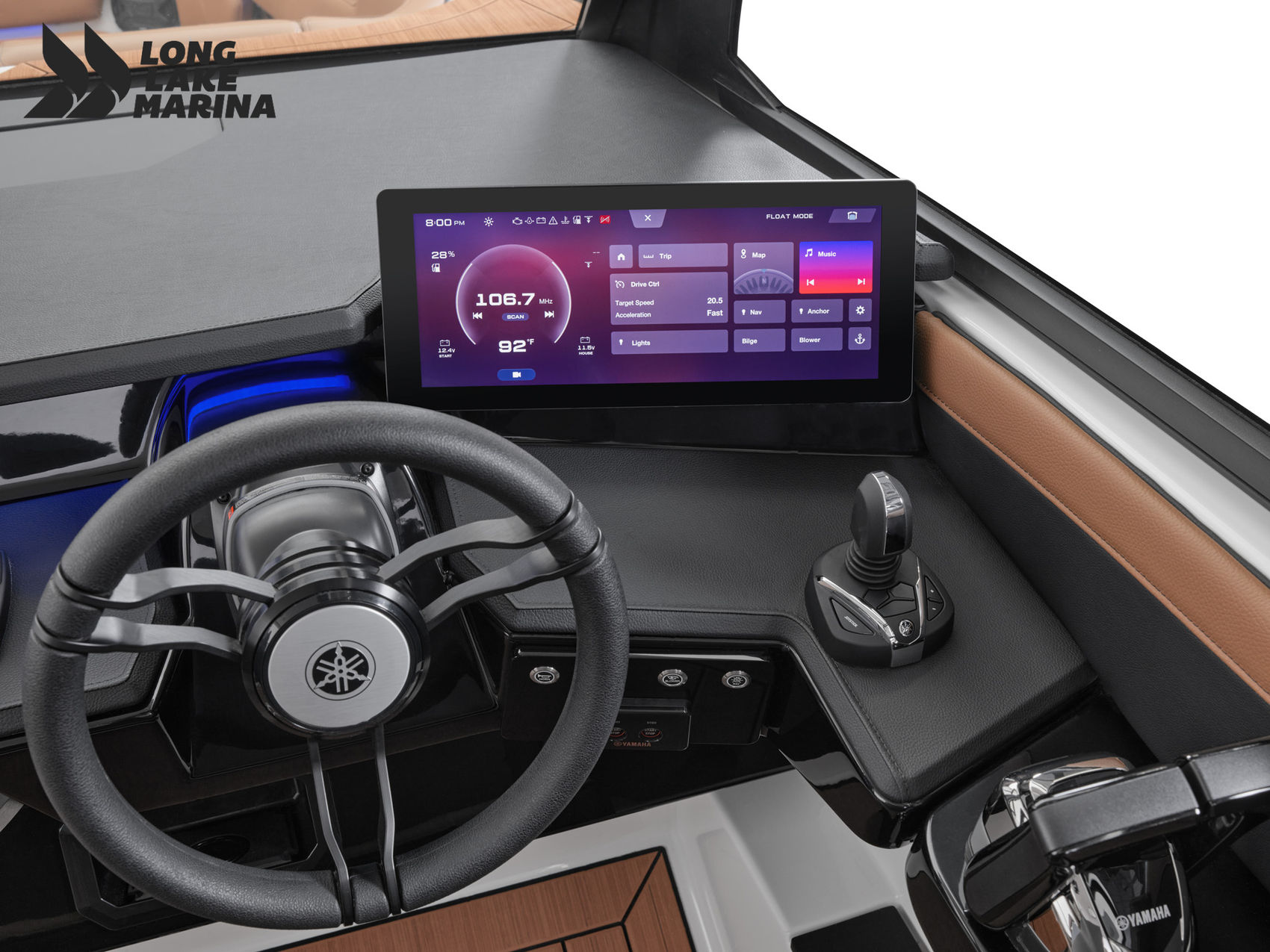 he 29-foot 295SD raises the bar for luxury, control, and space. Powered by twin supercharged 1.8-liter SVHO Yamaha marine engines producing a combined 500 horsepower, it gives you sweeping power, refined ride, and the safety of Yamaha’s jet propulsion with no exposed propellers. With a 28'5″ length, 9'1″ beam, and a dry weight of 7,145 lbs, this yacht-certified bowrider offers ample room and stability. The cockpit features premium seating, upgraded upholstery, a portside entertainment area, walk-through bow door, and versatile swim platform with stow-in-place swim-up seats. At the helm you’ll find a 15-inch Connext® touchscreen display, wireless charging, helm switch panels, premium Audison audio throughout, and Yamaha’s Helm Master EX joystick control — giving you pinpoint docking precision. The head compartment is lockable and plumbed, with sink and counter space, and the galley includes premium fixtures. With features like Quiet Cruise sound-dampening, RGB lighting, ample storage, and an optional windlass with anchor, the 2026 295SD blends flagship amenities with performance and technical finesse. -